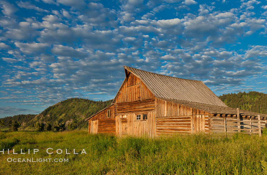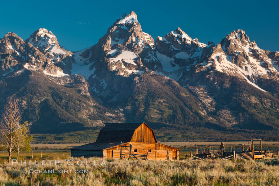 The John Moulton barn is the second of the two iconic early 1900's barns on Mormon Row in the Antelope Flats area of Grand Teton National Park and is often called "the most photographed barn in the United States": John Moulton barn at sunrise with Teton Range, on Mormon Row…