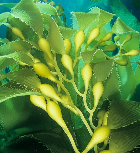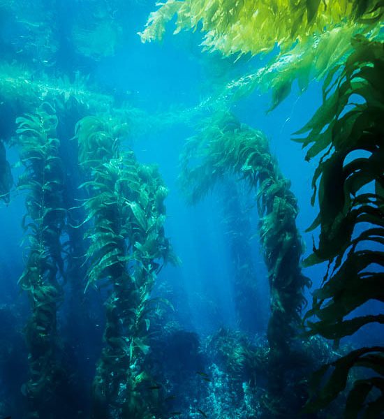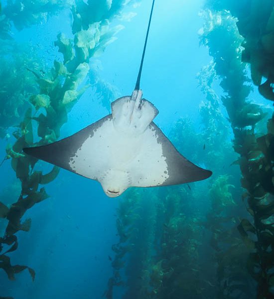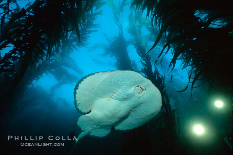 In this photo a California torpedo ray (Torpedo californica), or electric ray, is hovering amid the kelp forest while my diving partner Brad Silva is filming it with his bright torchlights and video camera. Santa Rosa Island, Channel Islands National Marine Sanctuary, California. Pacific torpedo ray in kelp forest, filming…